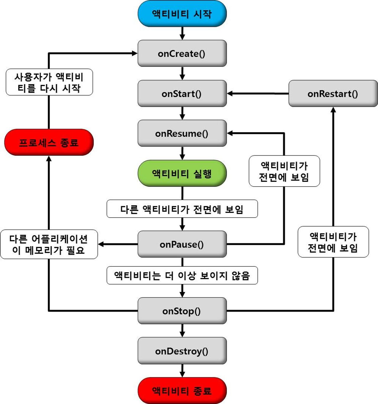 - 방해 이벤트 및 인터럽트로 PAUSED 상태에서, 전화를 다 받거나 하면 액티비티는 RESUMED 상태로 돌아오며 다시 한 번 onResume()을 호출한다 -> 즉, onPause() 중에 해제되는 구성요소를 다시 초기화하는 작업을 수행