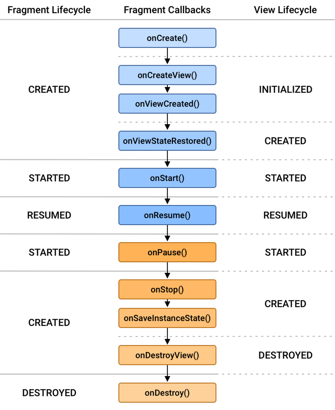 - onCreateView()를 통해 반환된 View 객체는 onViewCreated()의 파라미터로 전달된다 : 이 시점부터는 Fragment View의 LifeCycle이 INITIALIZED 상태로 업데이트 된다