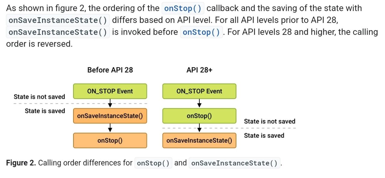 - API 28 이상부터 onStop()이 onSaveInstanceState()보다 먼저 호출됨 -> FragmentTransaction을 안전히 수행할 수 있는 마지막 지점은 onStop()